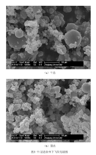 此外,還對(duì)濕態(tài)與干態(tài)條件下進(jìn)口處粉塵形貌變化進(jìn)行了表征。采用電子顯微鏡拍攝,放大倍率均為5000倍,采用鍍鋅片作為顆粒物的載體,可清晰觀測(cè)到10μm左右顆粒物形態(tài)。從圖3中可看出,在濕態(tài)狀態(tài)下,大顆粒物明顯減少,細(xì)顆粒物團(tuán)聚增強(qiáng),且顆粒邊緣清晰度降低。由此可見,液滴對(duì)10μm及以下的顆粒物具有一定的清洗作用,同時(shí)對(duì)細(xì)顆粒物具有團(tuán)聚的作用。