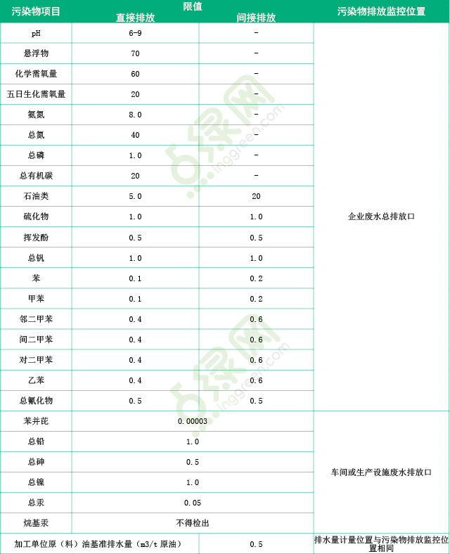 2015年7月1日開始實(shí)施的GB31570–2015《石油煉制工業(yè)污染物排放標(biāo)準(zhǔn)》和GB 31571-2015《石油化學(xué)工業(yè)污染物排放標(biāo)準(zhǔn)》,規(guī)定了石油煉制工業(yè)企業(yè)和石油化學(xué)工業(yè)企業(yè)及其生產(chǎn)設(shè)施的水污染物和大氣污染物排放限值、監(jiān)測和監(jiān)督管理要求。其中新建企業(yè)石油煉制工業(yè)企業(yè)水污染物排放標(biāo)準(zhǔn)如表2: